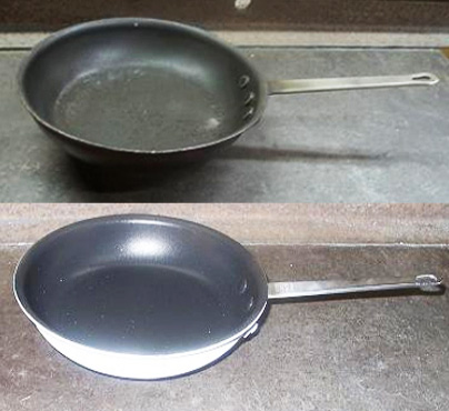 上記の写真は、使い古したスレンレス製のフライパンにフッ素(テフロン)加工を施したものです。